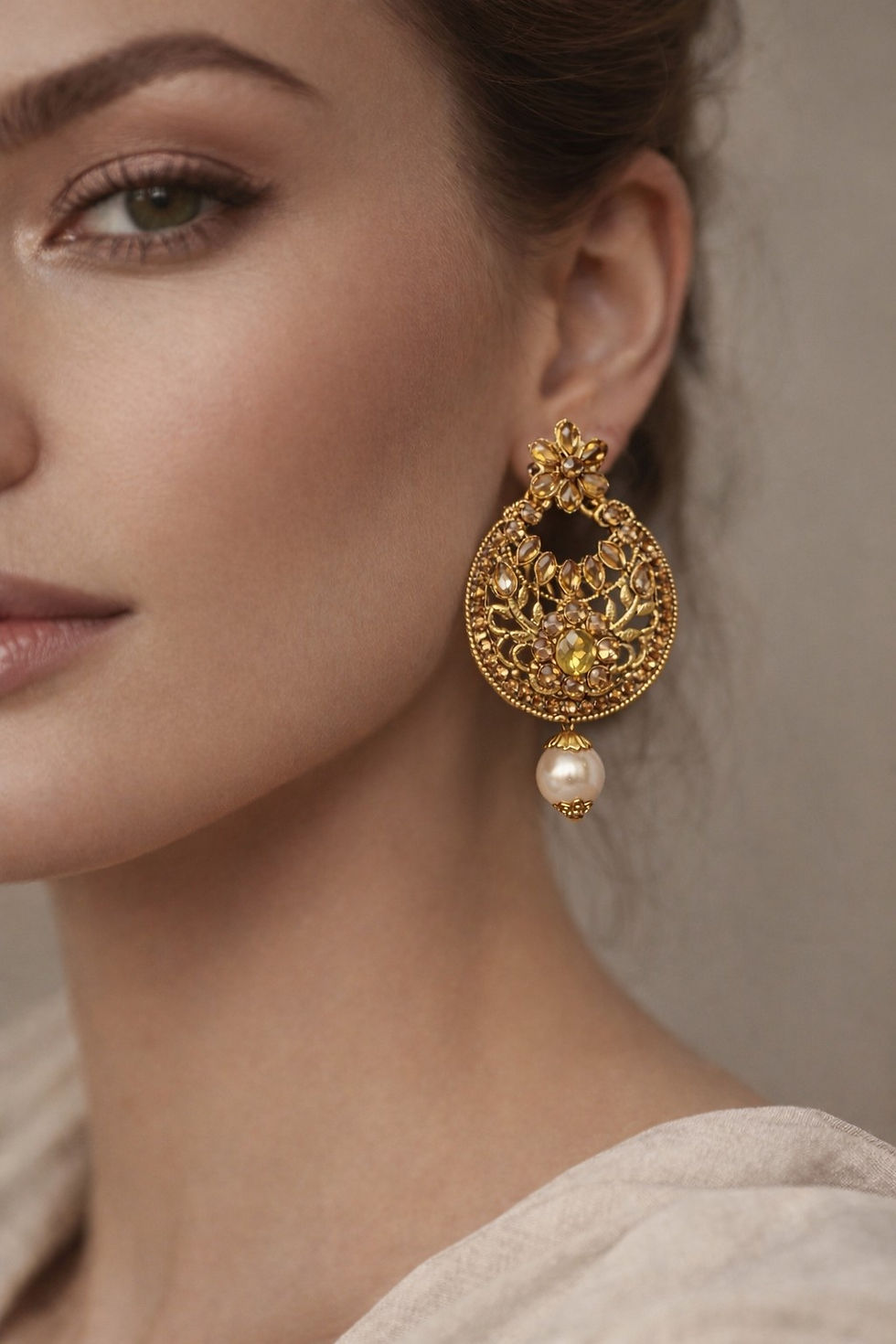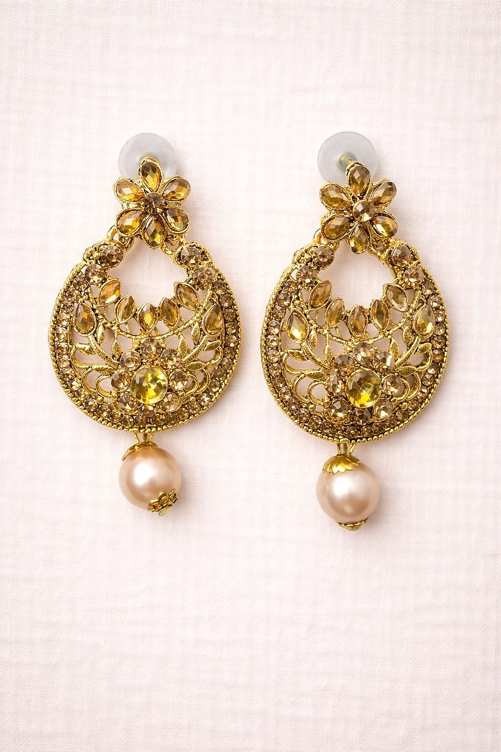 Athizay Gold-Toned Floral Stone Studded Chandbali Earrings with Pearl Drop