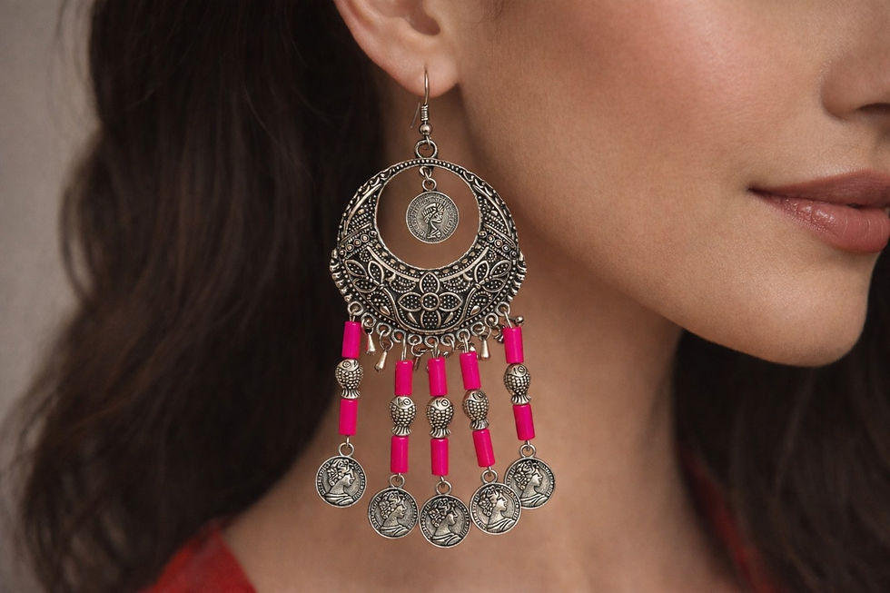 Athizay Oxidised Silver-Toned Boho Tribal Hoop Earrings with Pink Beads & Coin