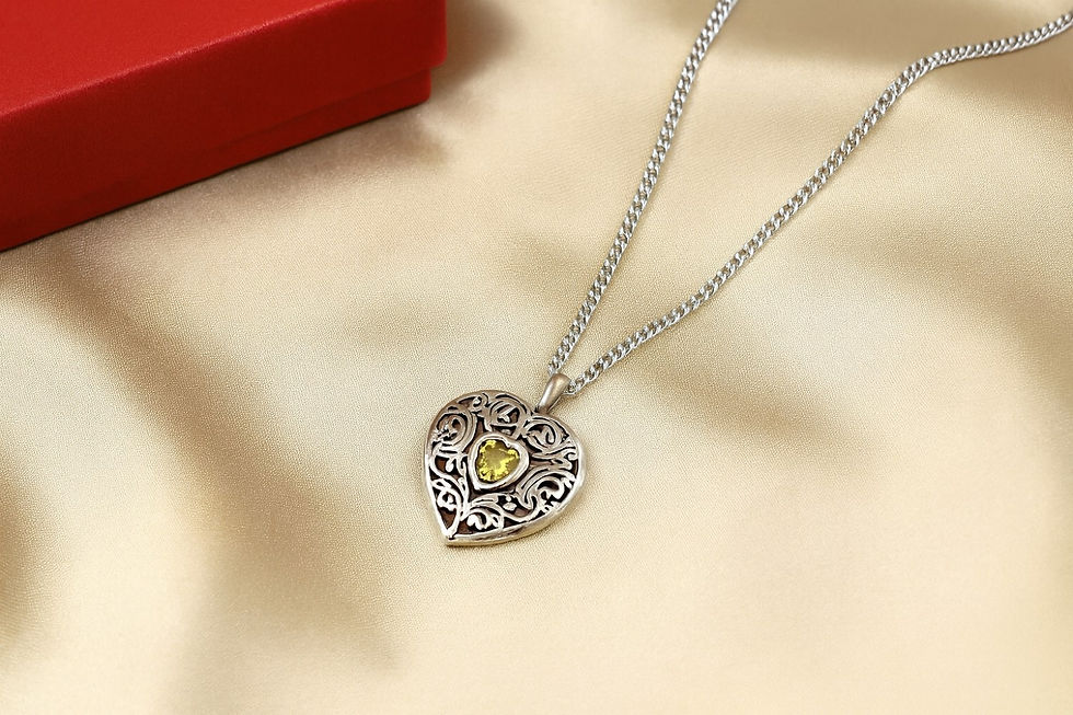 athizay Heart shaped silver pendant ladies necklace chain with mild yellow trans