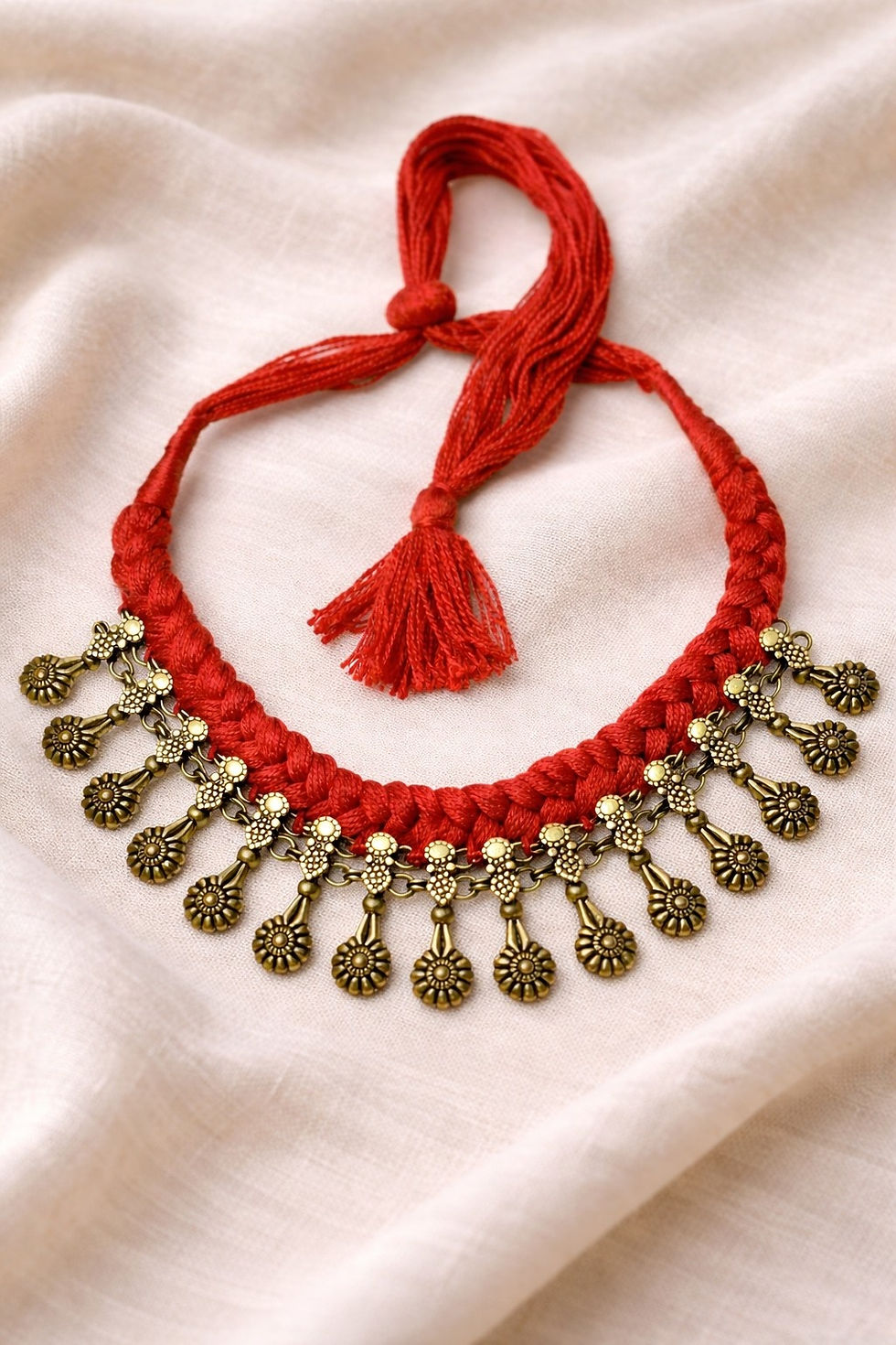 athizay Handcrafted Red Thread Necklace with Antique Gold Floral Charm Bead Desi